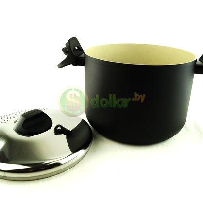 - Кастрюля оснащена удобной крышкой из нержавеющей стали с отверстиями для выпуска пара и эргономичными двойными ручками из бакелита.